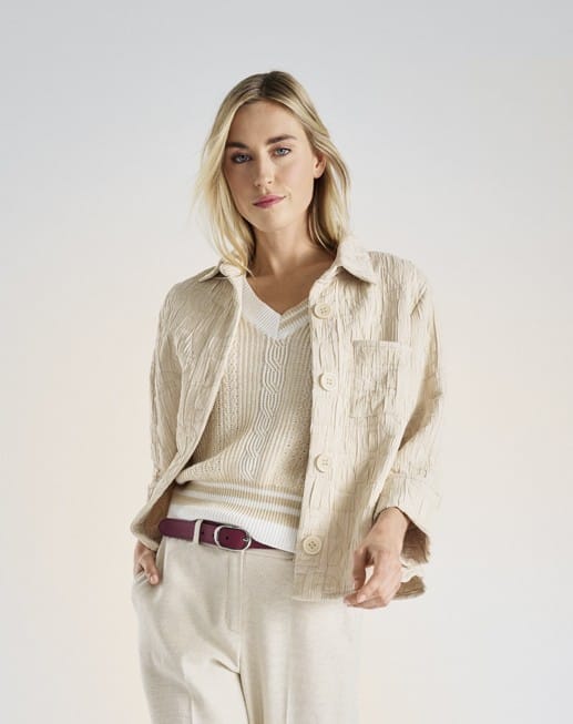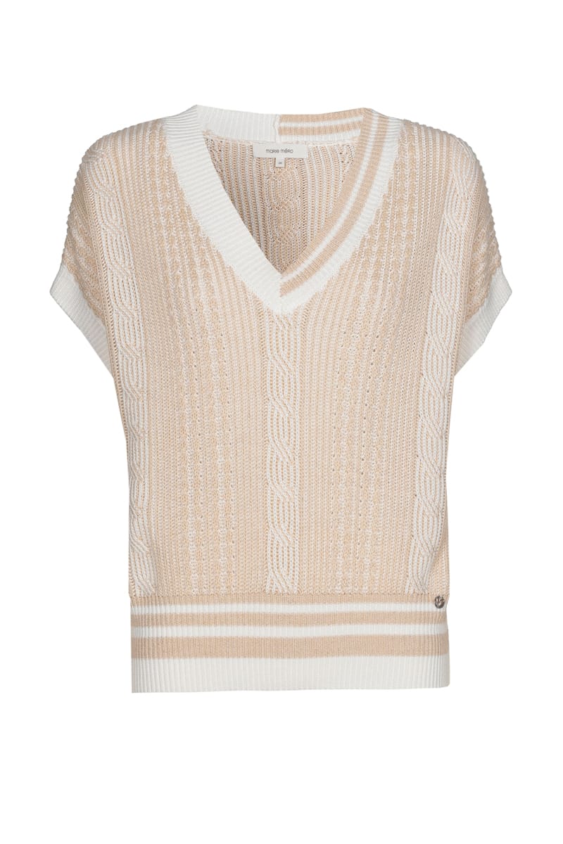 Beige-crème trui met aparte steek, v-hals, korte mouw en bicolor details aan kraag en boord. Chic en stijlvol, comfortabele snit en materie. Past zich aan elke gelegenheid aan.