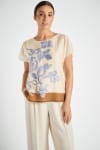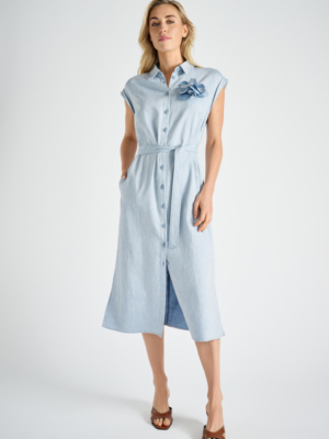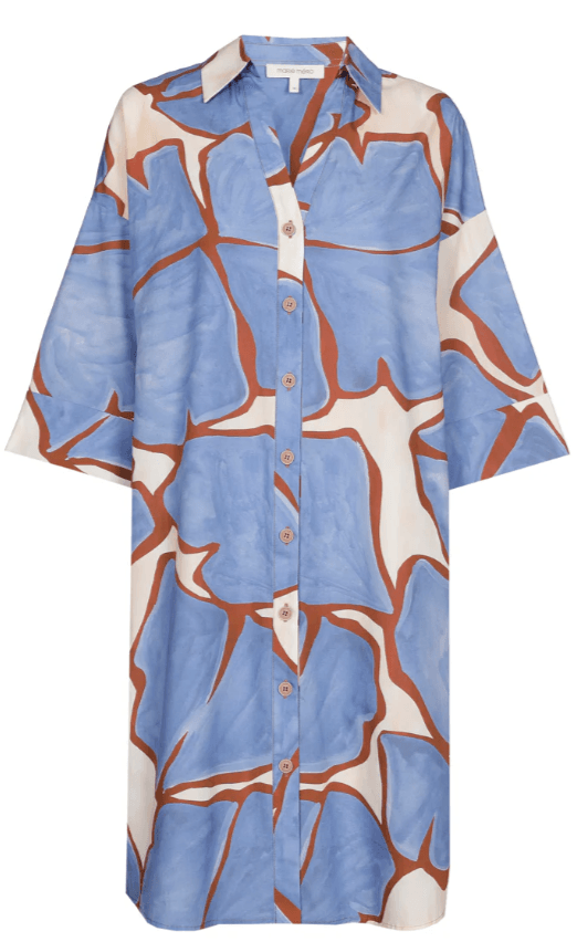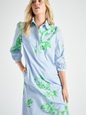 Blauw-ecru gebloemde, zomers hemdjurk. Deze mooie, vrolijke jurk met bloemenprint is een handige aanvulling op je zomergarderobe.