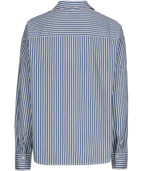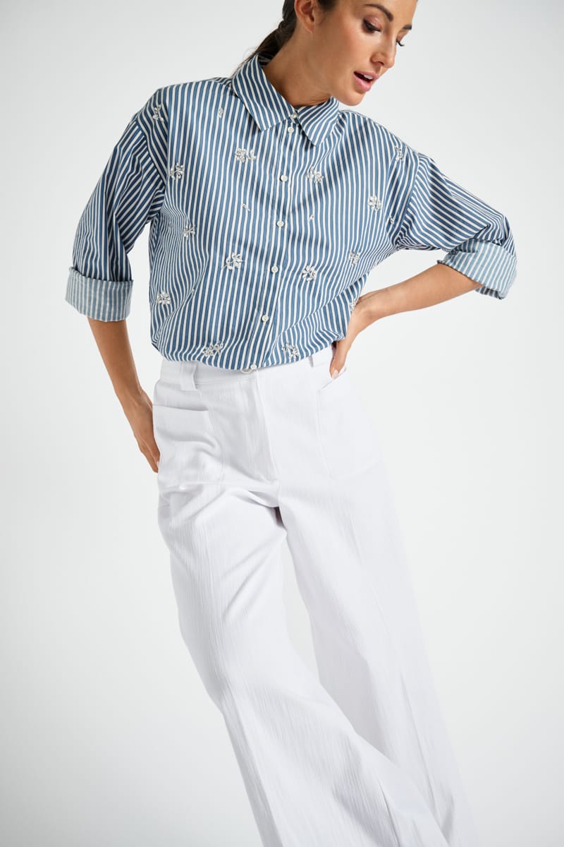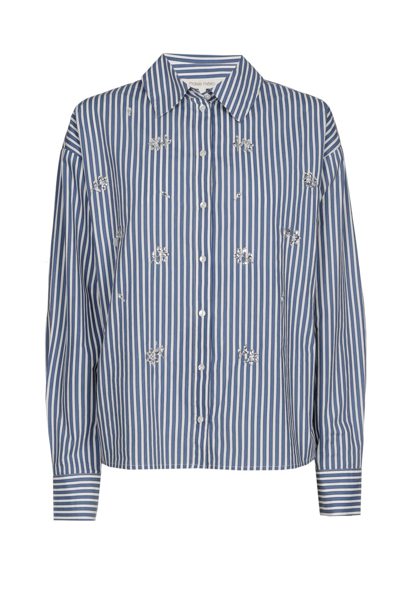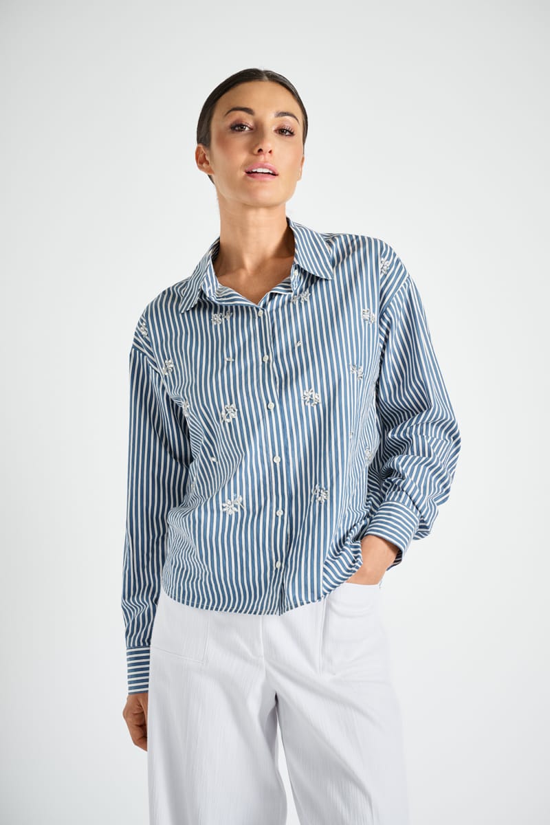 Blauw-ecru gestreepte bloes met opgestikte bloemenpailletten: trendy combo van chique en sportief. Klassieke en iets kortere snit, tijdloos en modern. Perfect te dragen bij zowel een jeans als een geklede broek of rok.