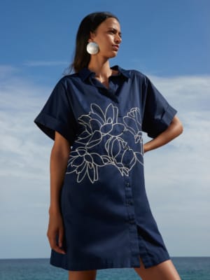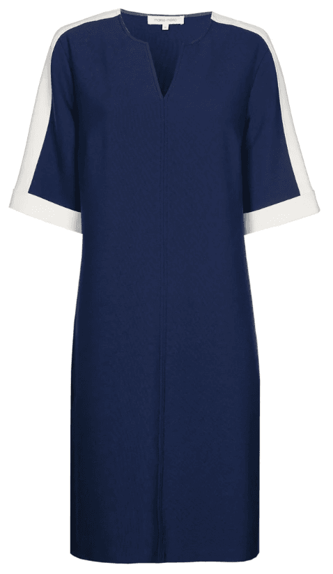 Soepel vallende, comfortabele en chique jurk op knielengte in marinekleuren. Elegante afwerking: open V-hals, ecru boord aan de schouder en driekwart mouwen met een ecru kleurige omslag.