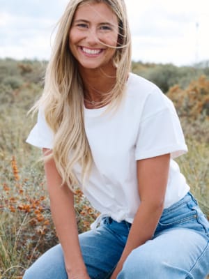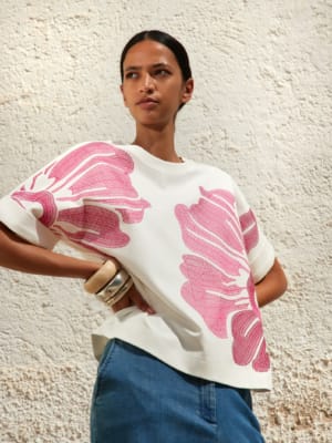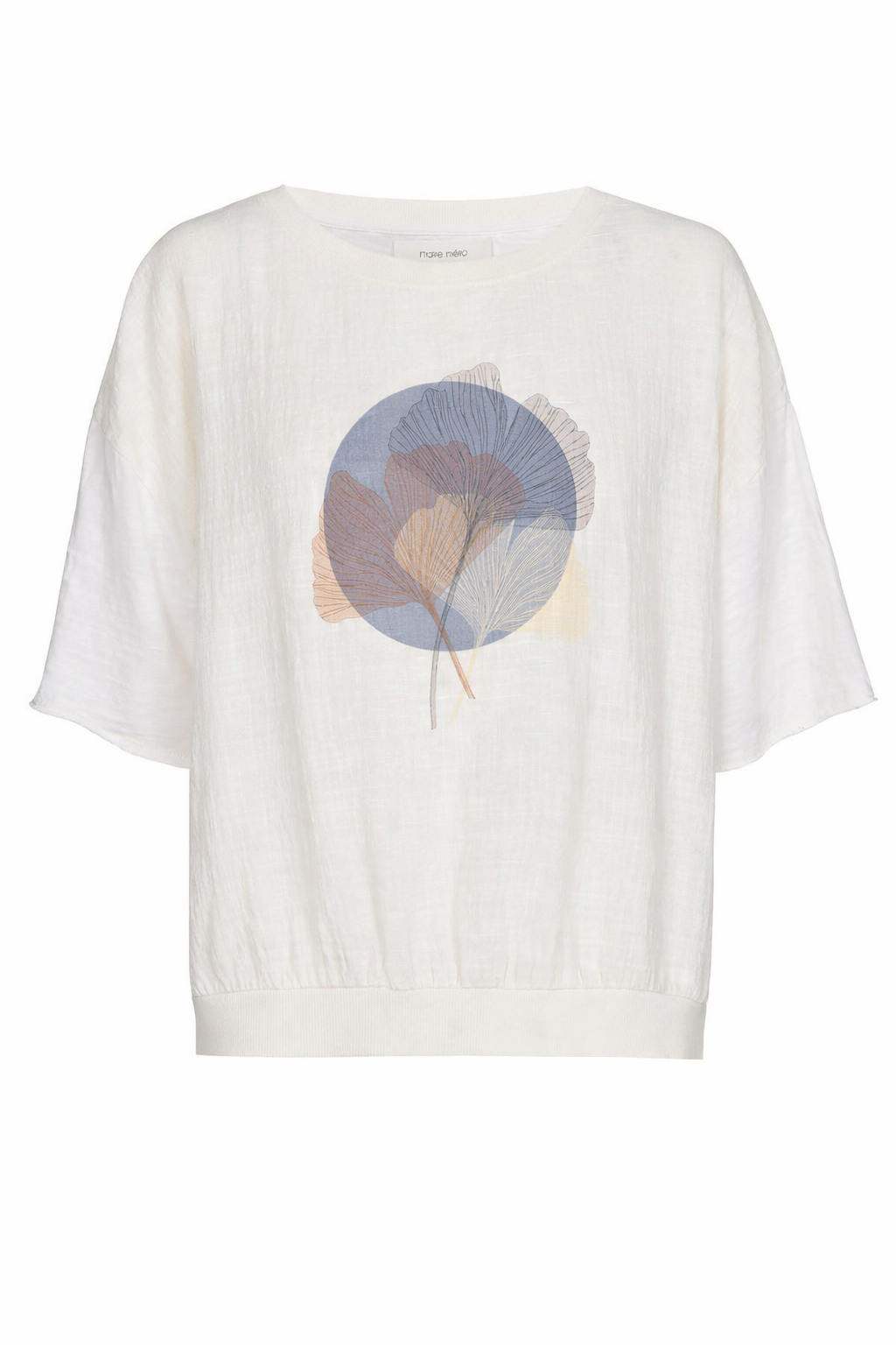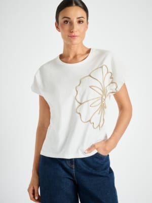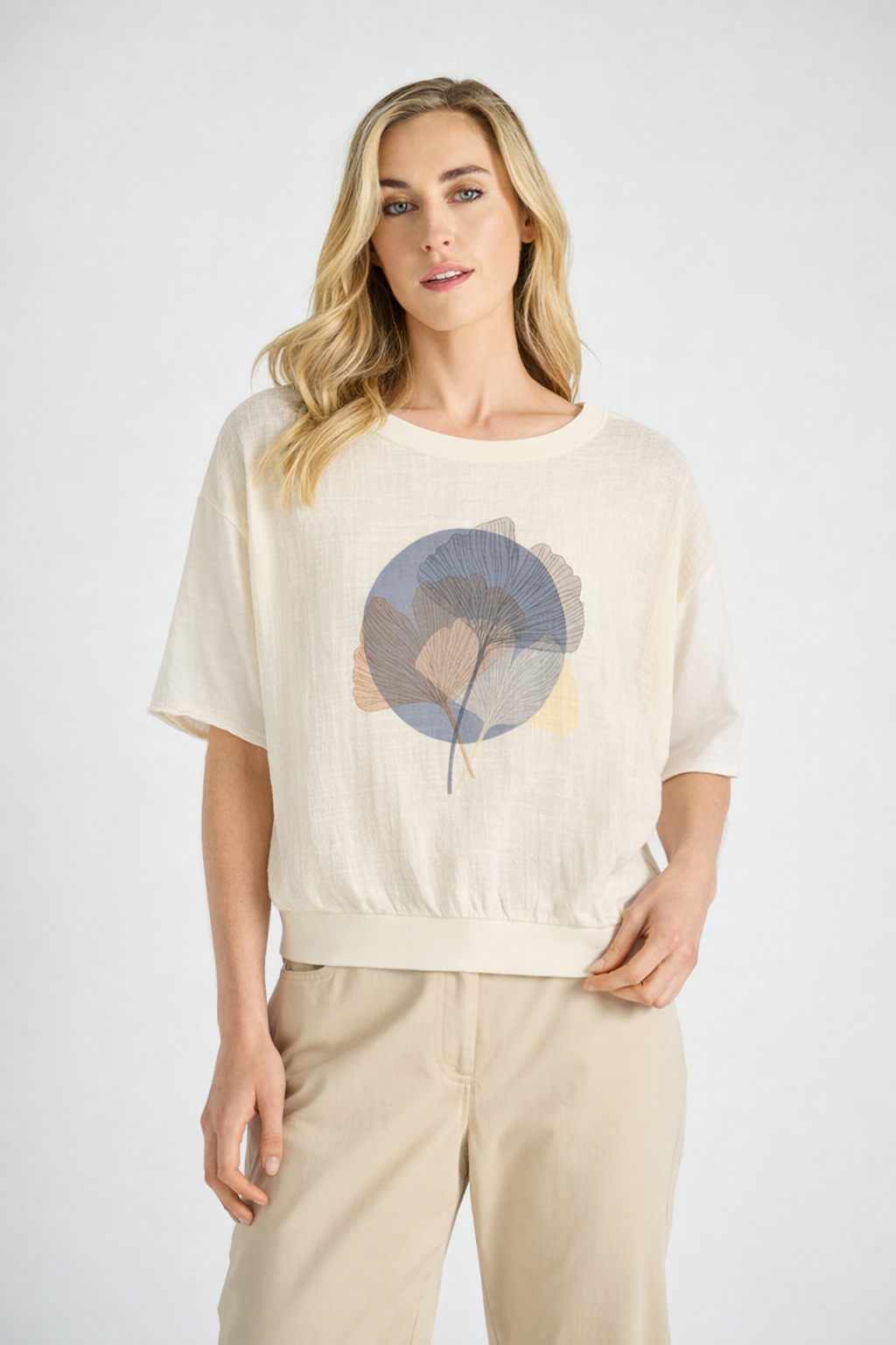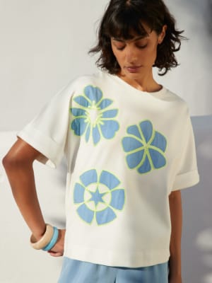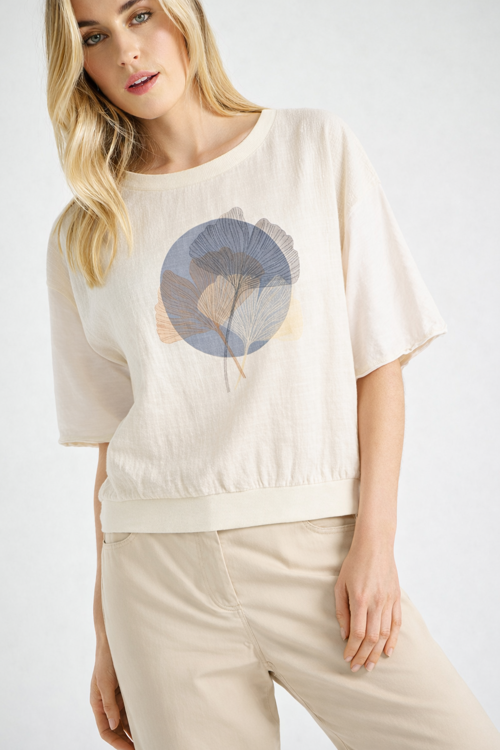 Stijlvol crème los katoenen t-shirt met kleurige bloemenprint vooraan. Ronde hals, korte mouw, soepel katoen. Draag je zo, of onder een bovenstuk, voor een vrolijke look bij zonnige dagen.