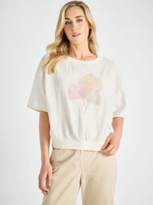 Stijlvol crème los katoenen t-shirt met kleurige bloemenprint vooraan. Ronde hals, korte mouw, soepel katoen. Draag je zo, of onder een bovenstuk, voor een vrolijke look bij zonnige dagen.