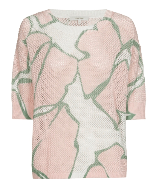 Elegant en opvallend crochet truitje met mooie zomerse bloemenprint. Ronde hals, driekwart mouw, subtiele transparantie. Eenvoudig model dat elke outfit, chic of casual, meteen opfleurt.