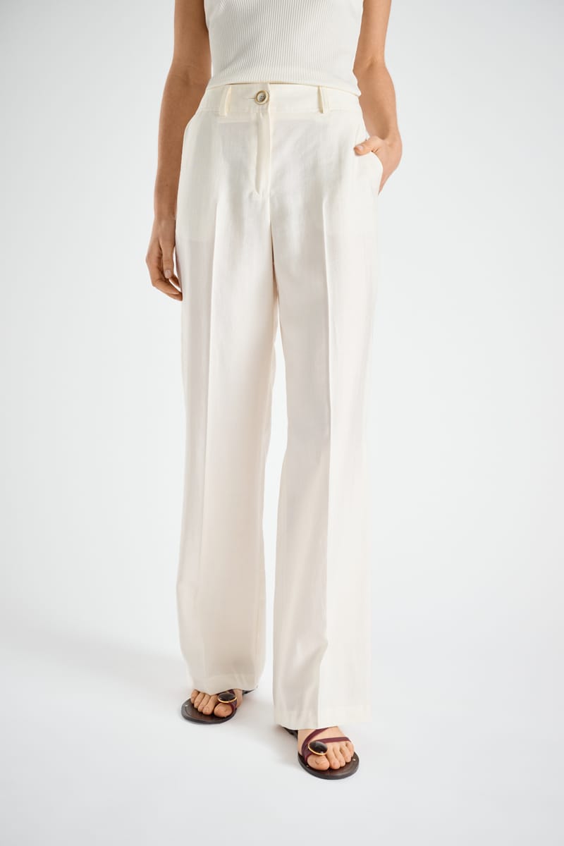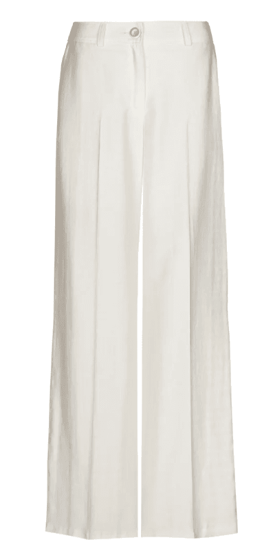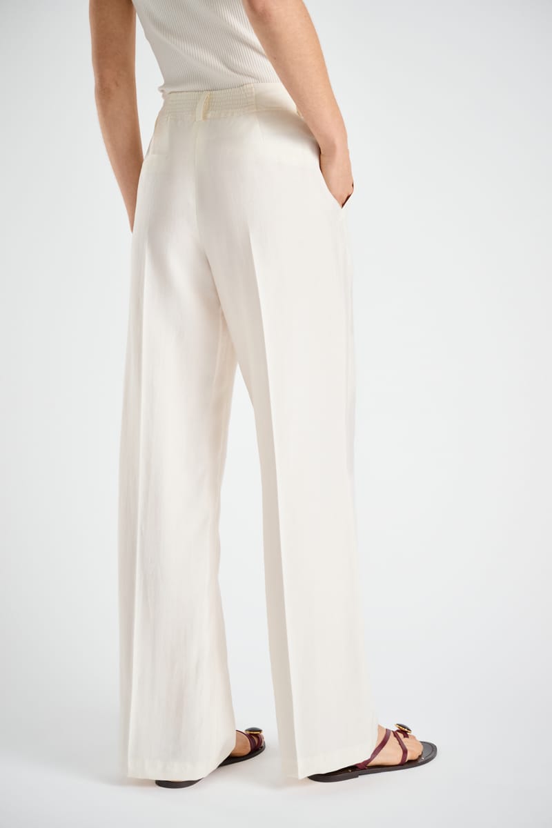Crèmekleurige rechte broek met bandplooi voor stijl en elastiek achteraan de taille voor comfort. Soepele en elegante zomerbroek, niet transparant in een aangename, lichte, wasbare en kreukvrije materie.