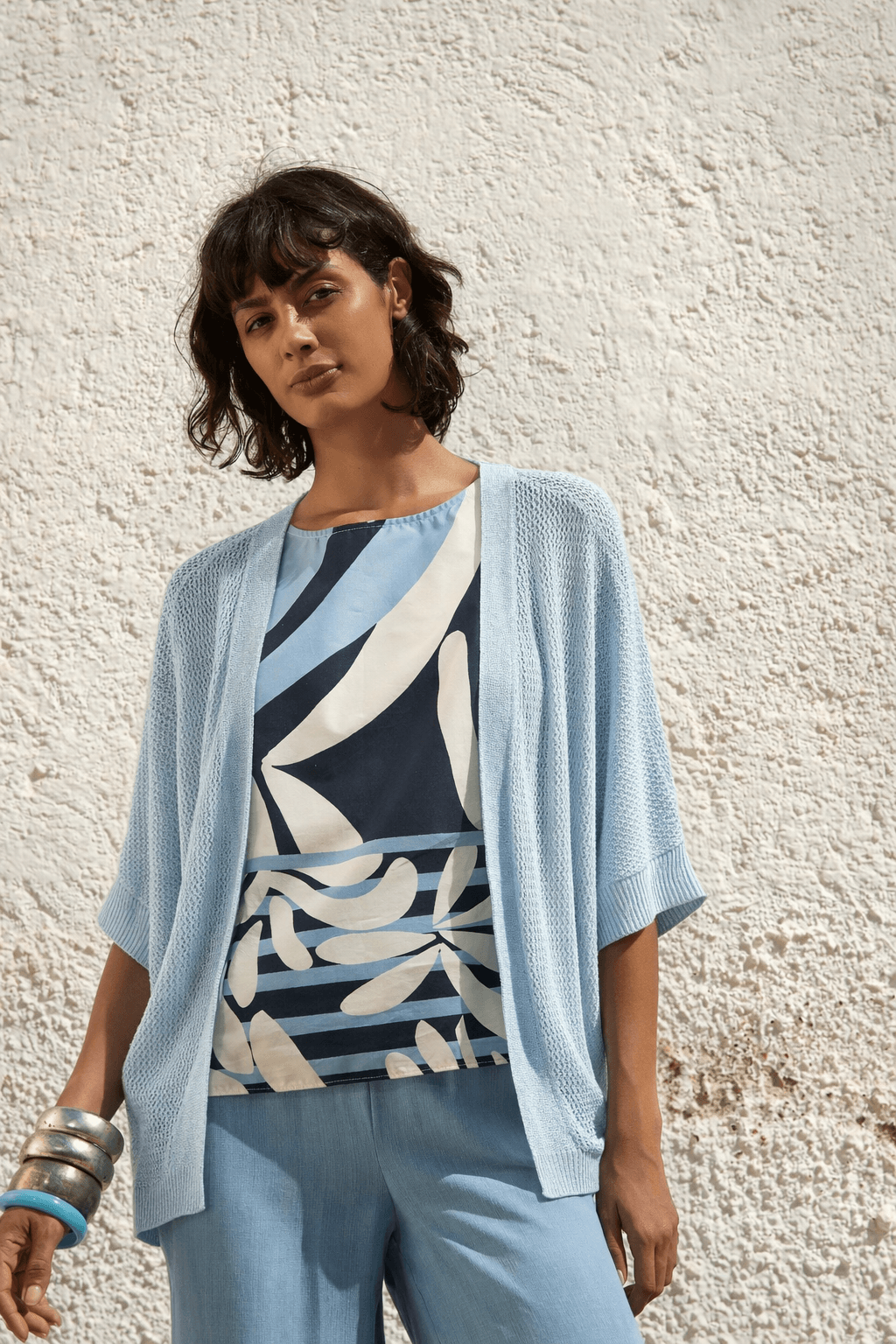 Luchtige lichtblauwe cardigan met open breisel en korte mouwen. Perfect over een top of jurk. Comfortabel, stijlvol en ideaal voor warmere dagen of frisse avonden.