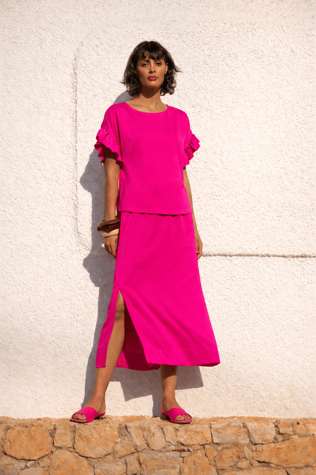 Deze fuchsia bloes voor dames is gemaakt van een soepelvallende stof en heeft een elegante, losse pasvorm. De korte mouwen met vrouwelijke volants geven het item een verfijnde uitstraling. Dankzij de ronde hals en tijdloze snit is deze blouse eenvoudig te combineren, zowel casual als gekleed. Perfect als los item of als set met de bijpassende rok.