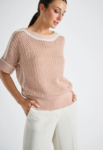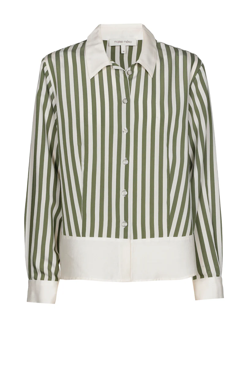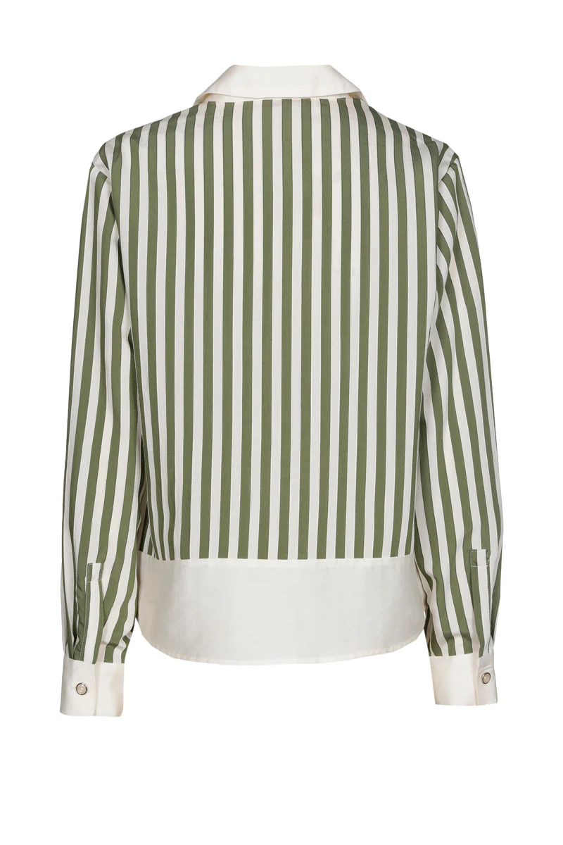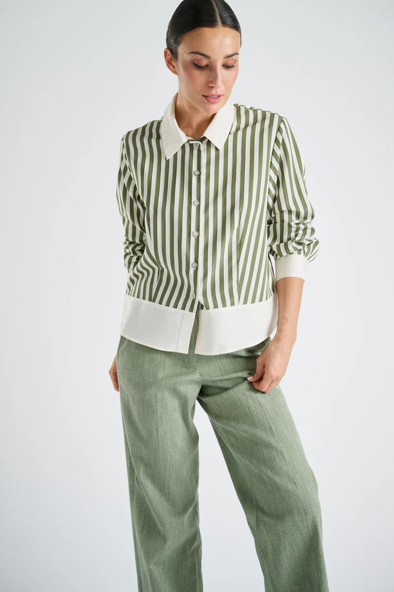 Stijlvolle bloes met verticale strepen in groen en ecru. Voorzien van een klassieke kraag en 3/4 mouwen en een comfortabele pasvorm. Contrasterende manchetten, kraag en tailleband. Perfect te combineren met een pantalon of jeans voor een frisse, moderne look.