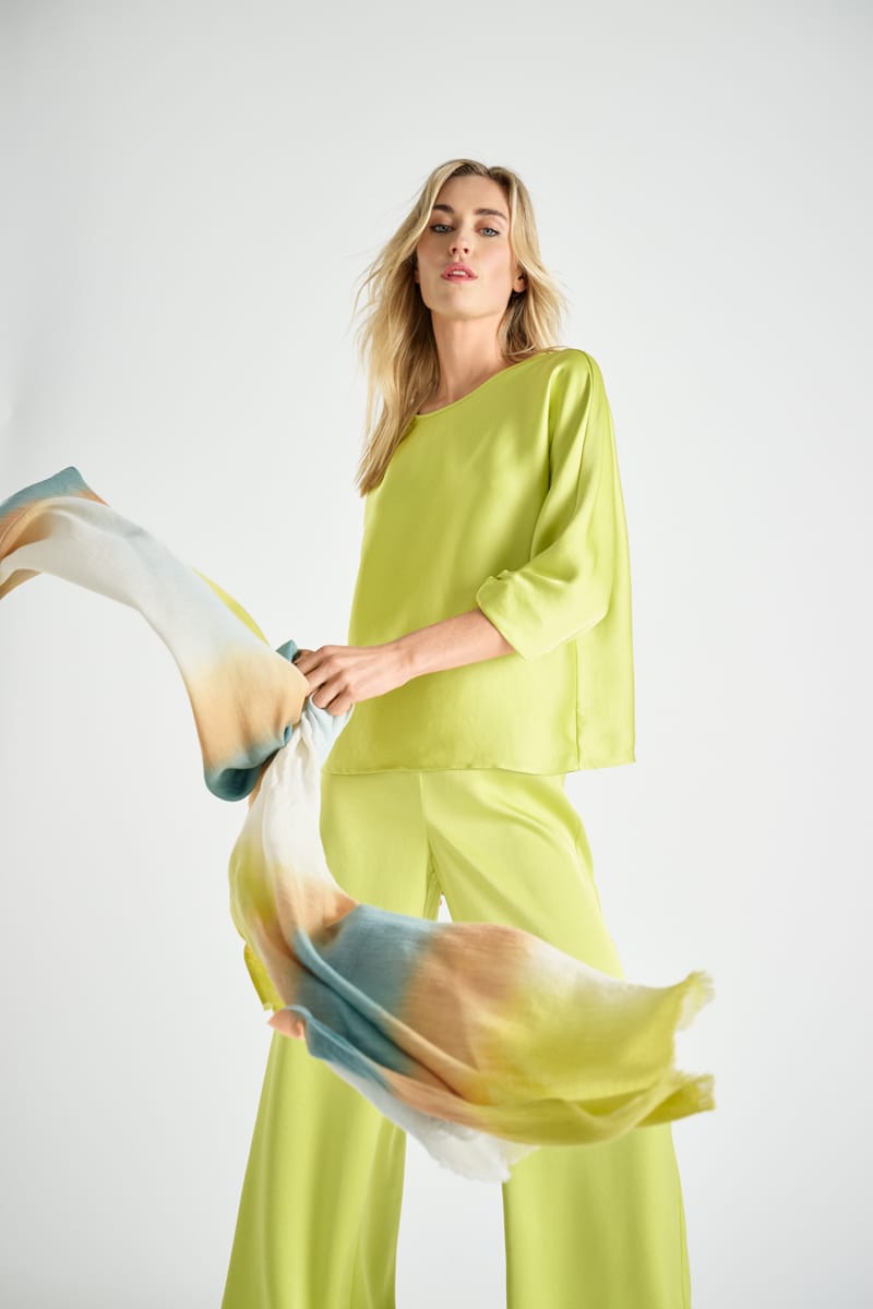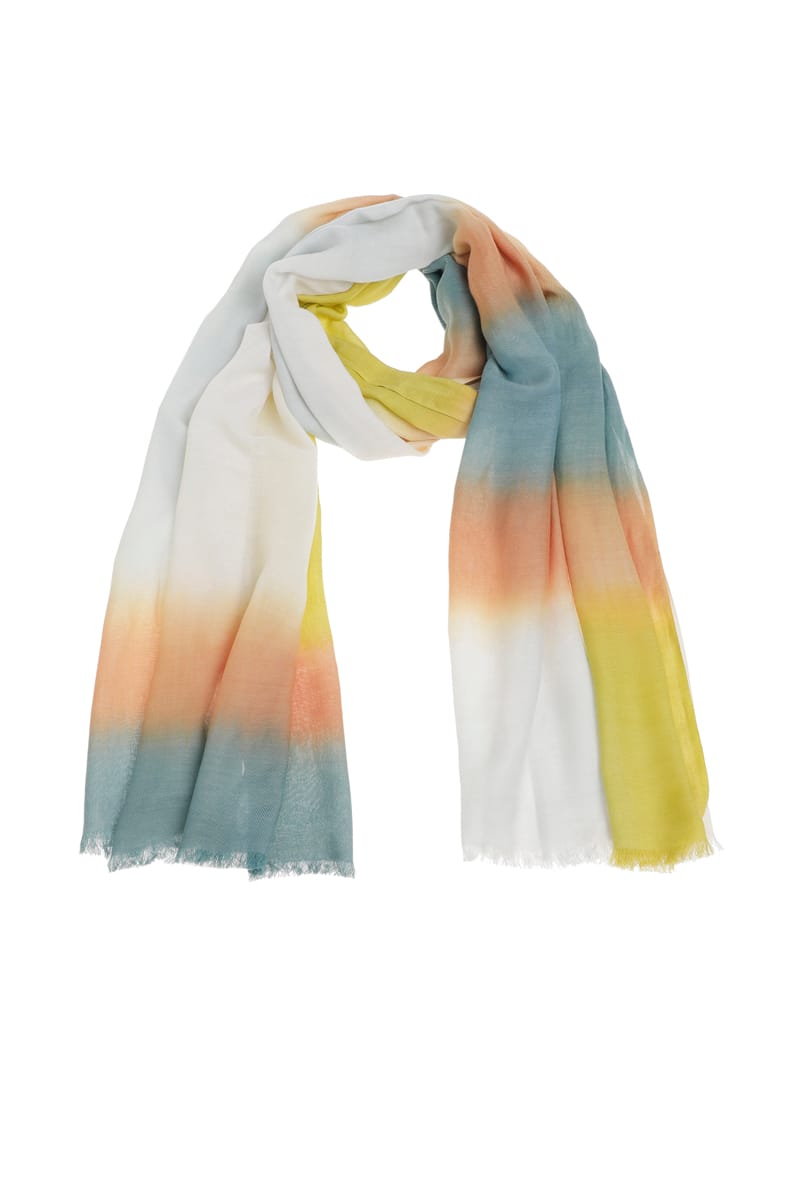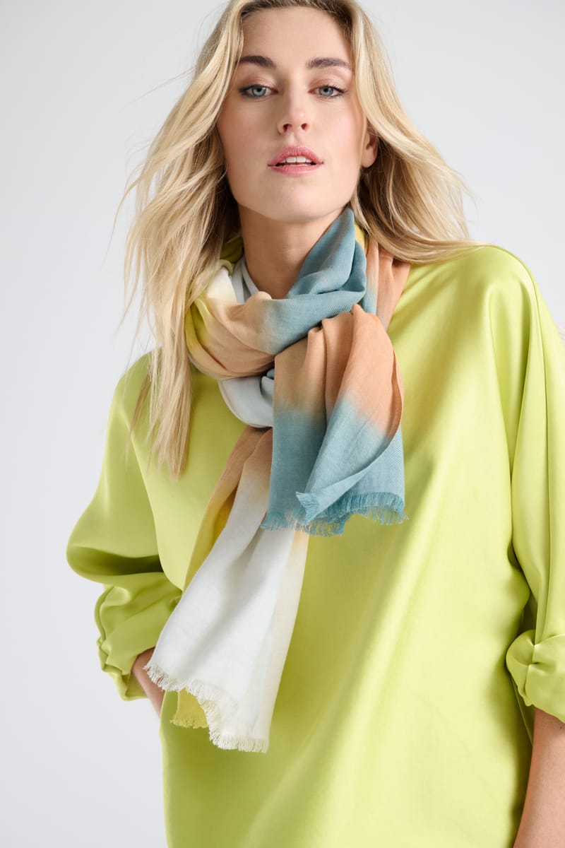 Stijlvolle lange katoenen dégradé sjaal met bijzonder rijke kleurschakering. Chic en oneindig combineerbaar.