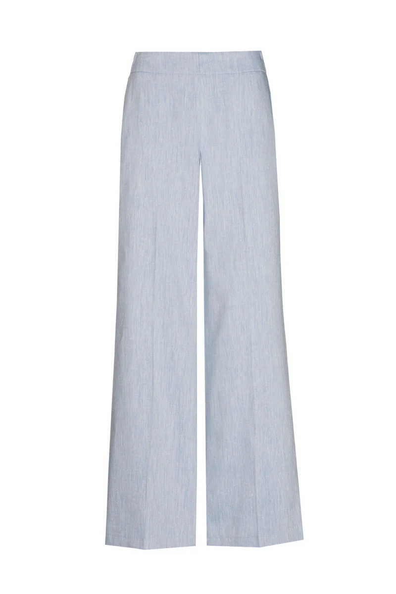 Lange rechte lichtblauwe broek met bandplooi, platte taille met elastiek achteraan, zakken. Super aangename en comfortabele katoen-linnen mengeling. Chique broek voor alle dagen of met een stijlvol bovenstuk.