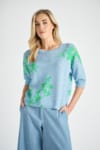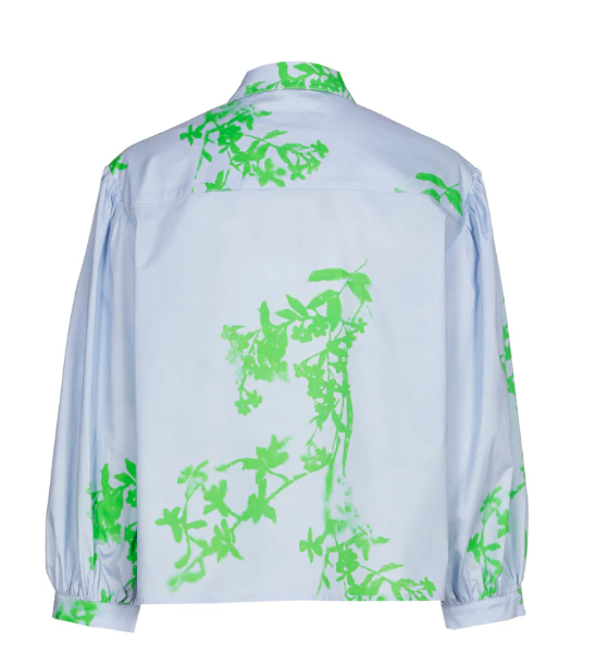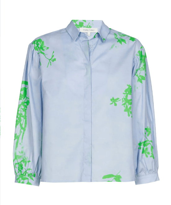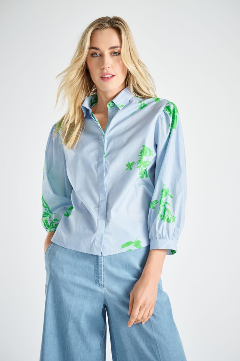Lichtblauwe bloes met groene bloemen, loose fit en een lichte pofmouw voor een speelse, vrouwelijke uitstraling en een jonge, frisse look. Perfect te combineren met een jeans of geklede broek in casual-chic stijl.