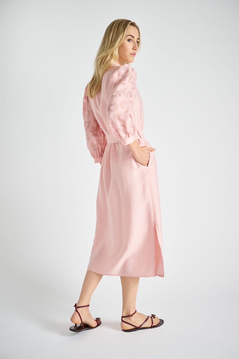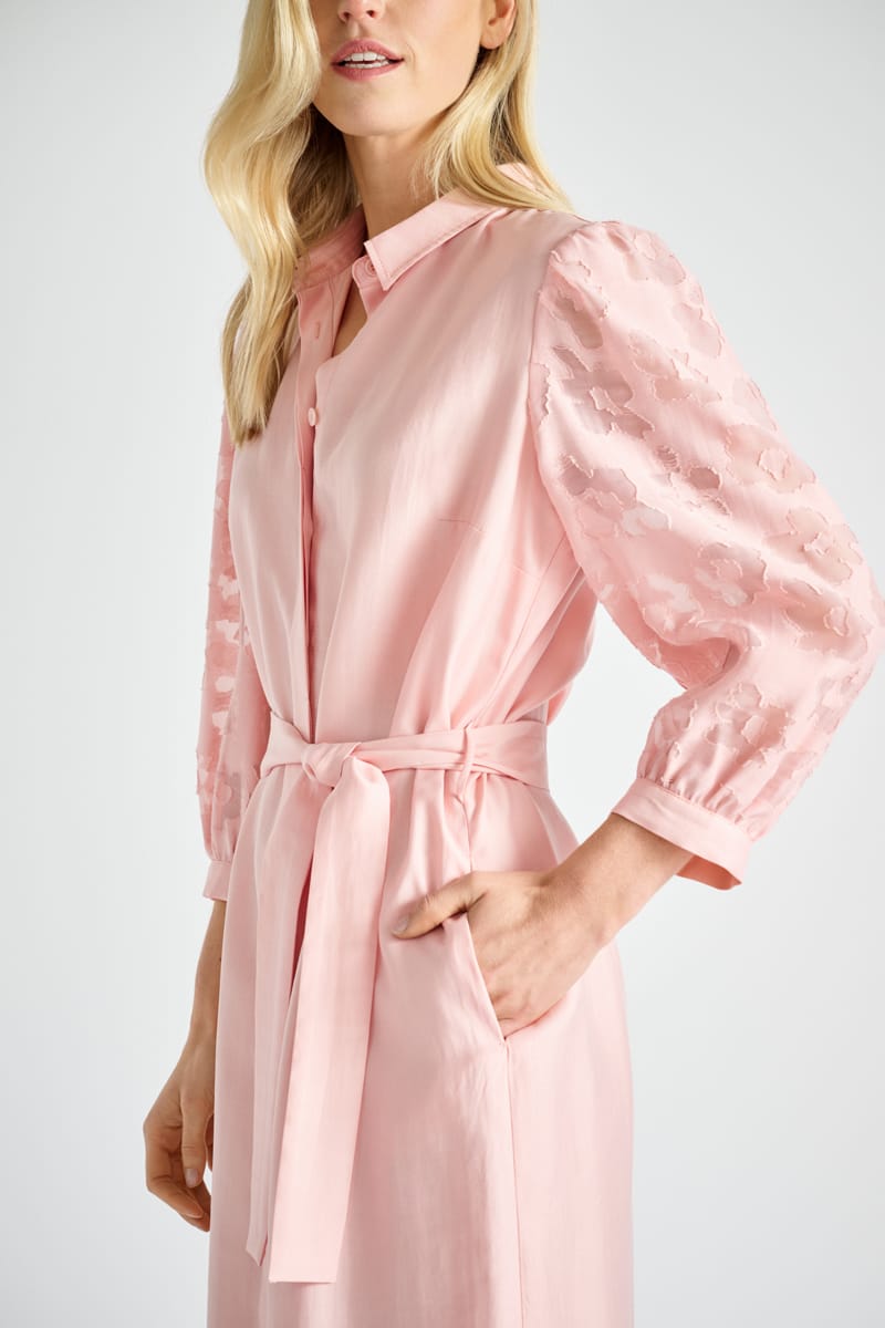 Elegant en stijlvol hemdskleed met mouwen in kant. Midi-lengte, knopen tot beneden en riem. Ziet er eenvoudig uit, maar is werkelijk super chique.