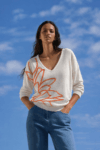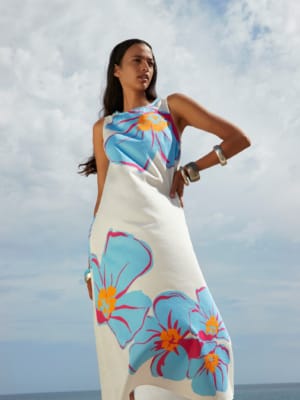 Luchtige jurk met grafische print, met V-hals en strikdetail op de schouders. Ideaal voor zomerse dagen.