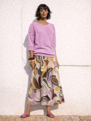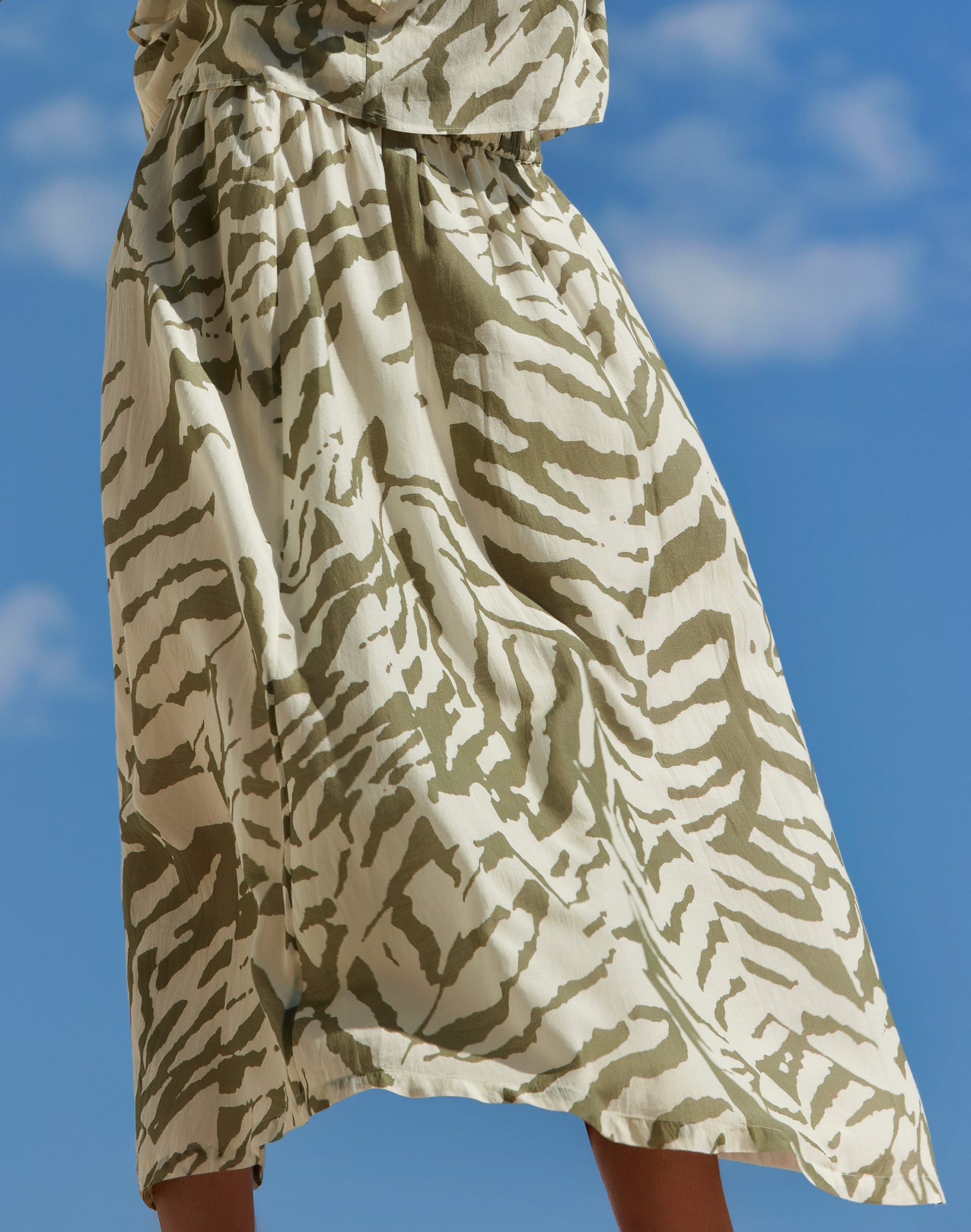 Comfortabele, soepel vallende rok met trendy print in kaki en crème. De elastische tailleband zorgt voor een perfecte pasvorm, terwijl de midi lengte een elegante uitstraling geeft. Ideaal voor zowel casual al geklede looks.
