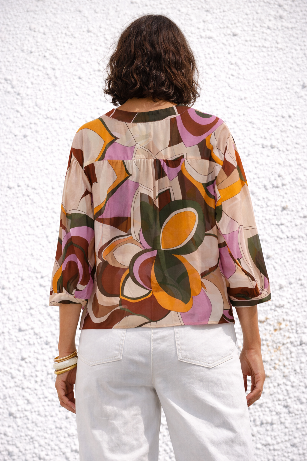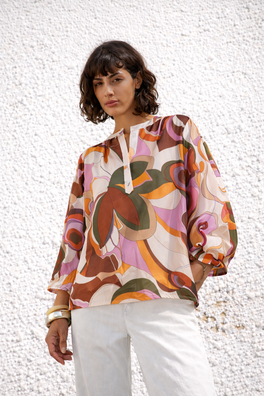 Deze damesbloes is uitgevoerd in een soepelvallende stof met een lichte glans en een grafische print. De open V-hals geeft de bloes een elegante, luchtige uitstraling. De 3/4 mouwen met volume zorgen voor een vrouwelijke en comfortabele fit. Ideaal om te combineren met een broek of rok voor een stijlvolle look.