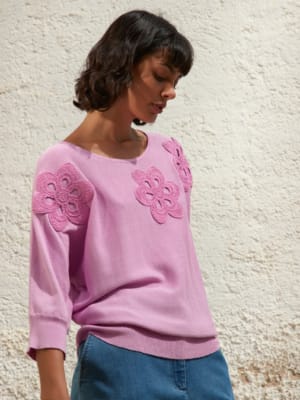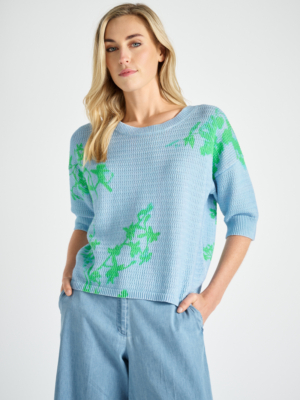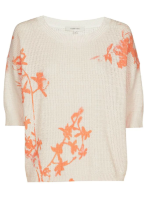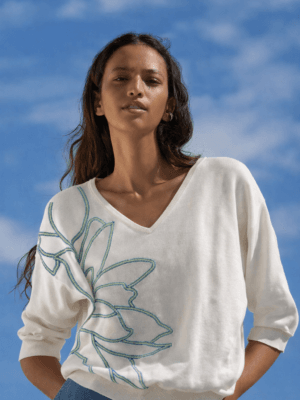 Zeer zachte en stijlvolle pull met bloemen in badstof op geprint. Heel mooi op zich maar ook onder jas of blazer. Iets dikkere stof om het seizoen mooi te beginnen.