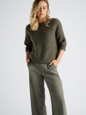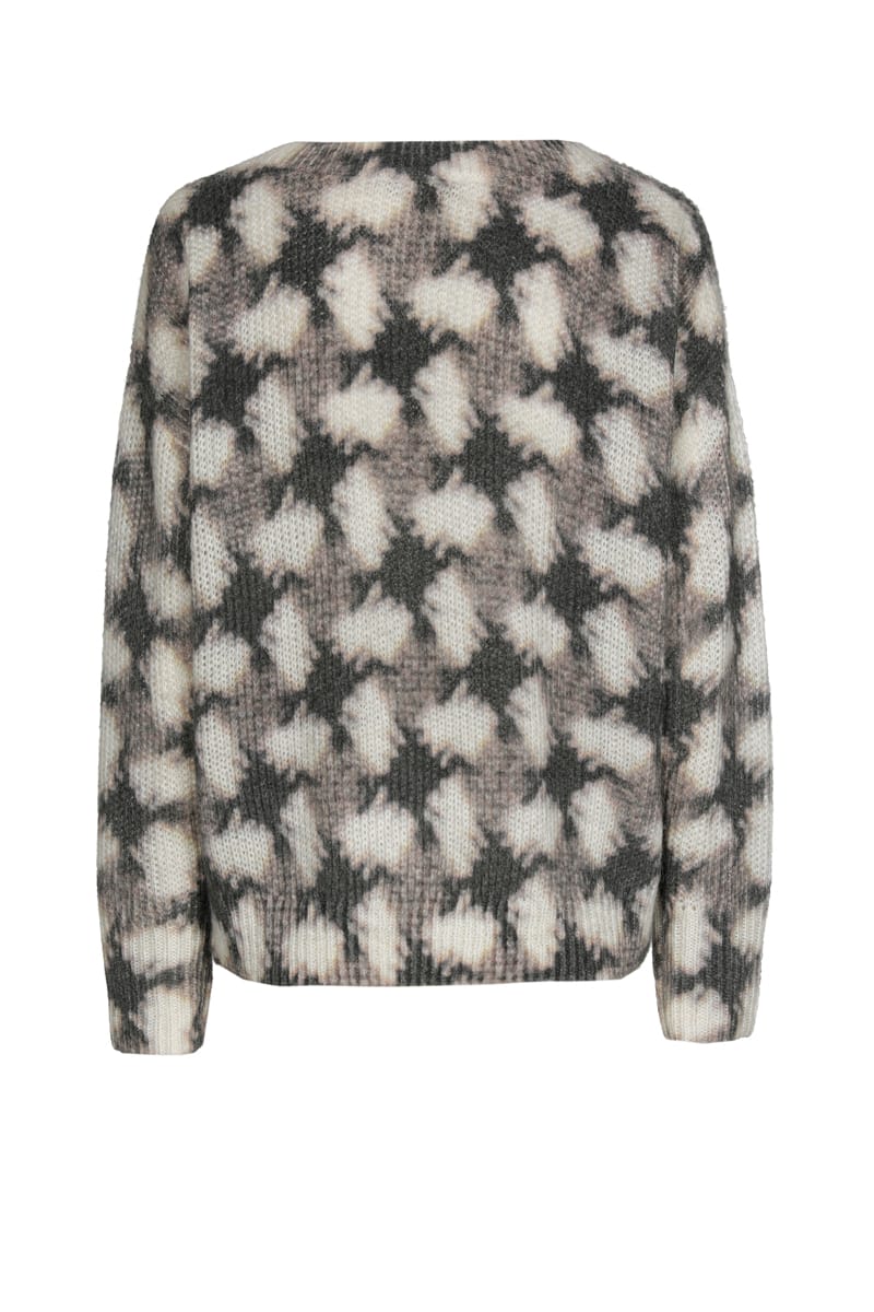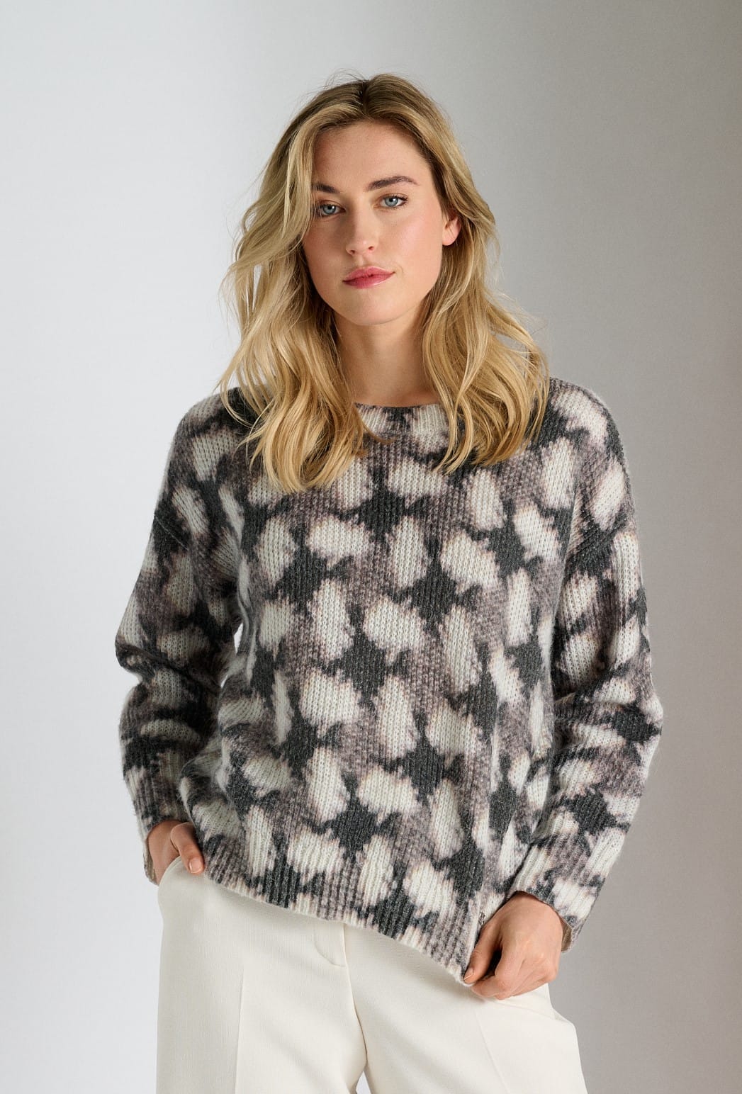 Deze kleurrijke pull in een zachte mix van alpaca en wol is niet alleen warm en comfortabel, maar ook een stijlvolle blikvanger. Het opvallende motief in taupe en ecru komt prachtig tot zijn recht dankzij de ronde hals en losse pasvorm.