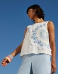 Top in zacht lichtblauw met opvallend grafisch borduurwerk vooraan. Een moderne eyecatcher met een cleane snit, perfect voor een stijlvolle zomerlook.