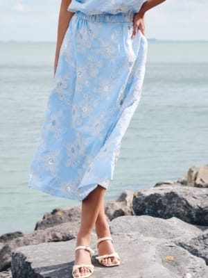 Prachtige soepele stoffenmengeling voor deze schuin geknipte rok, een stijlvolle combo met de bijpassende bloes. Een uitblinker op elk feestje! Ook casual te dragen met een t-shirt of basic hemd.
