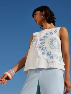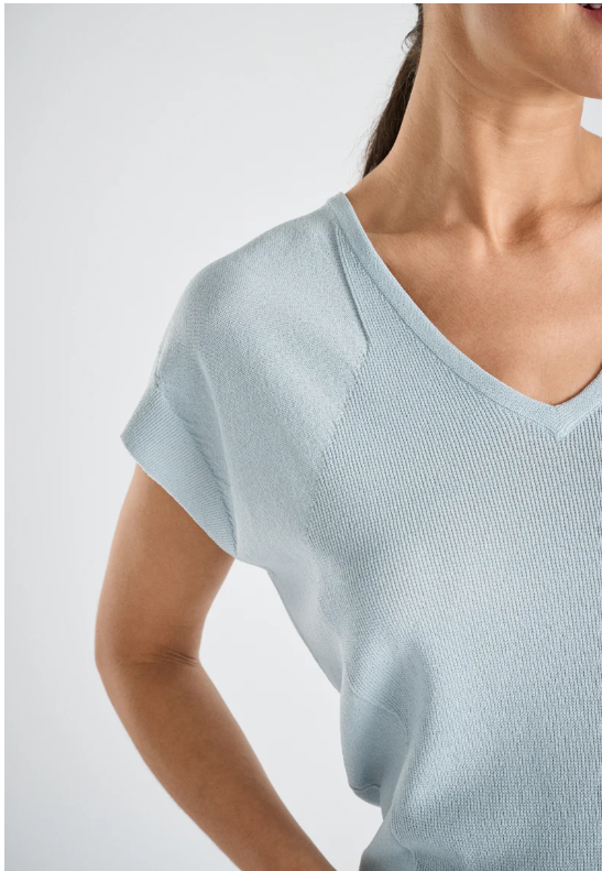Deze V-hals top is in V gekipt waardoor hij netjes de schouders en bovenarmen bedekt. Lekker luchtig en fris in de zomer. Kan zo, of onder alle mooie bovenstukken.