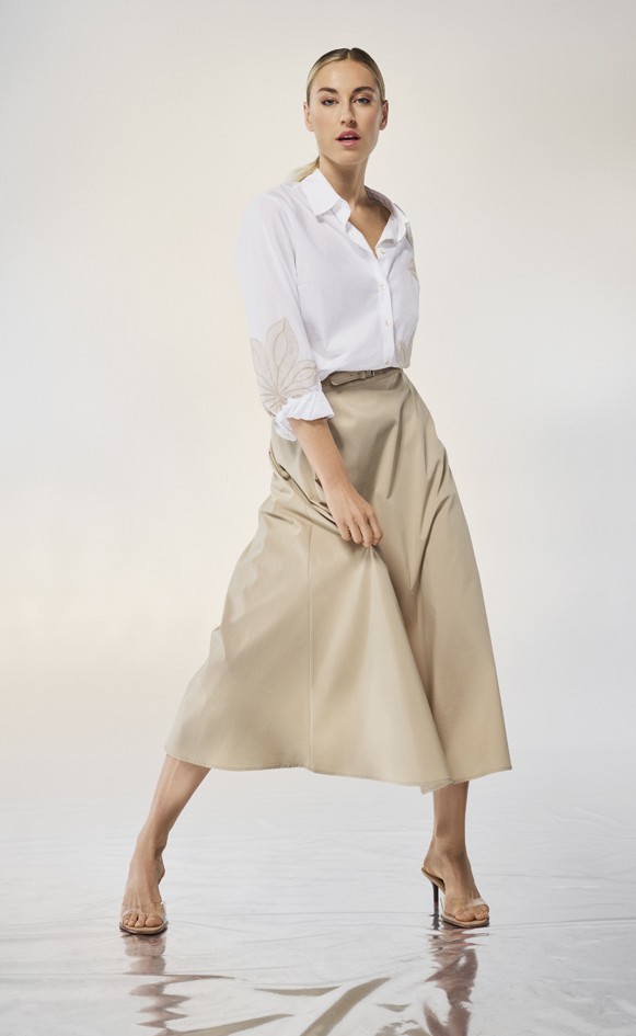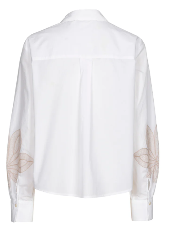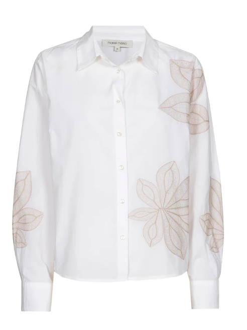 Elegante witte bloes in puur katoen met subtiele, beige geborduurde bloem. Aangename kwaliteit en trendy uitstraling. Veelzijdig stuk dat makkelijk te combineren is met zowel jeans als rokken.