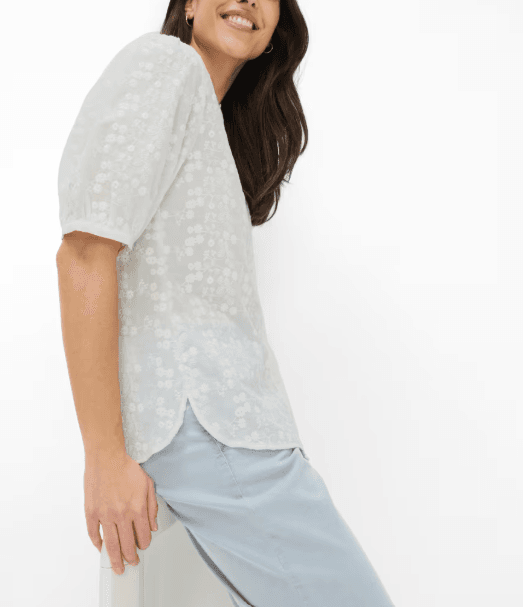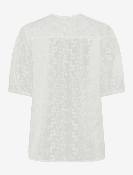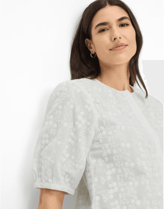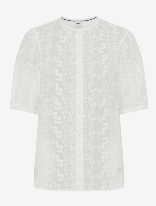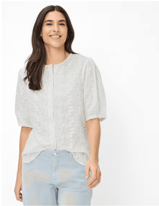 Dit bloesje oogt heerlijk fris en worden elegant verfijnd door fijn, tonaal bloemig borduurwerk. De strak gehouden ronde hals benadrukt de moderne look en de doorlopende knopenlijst met kleine, bijpassende knoopjes zorgt voor een nette, stijlvolle voorkant. Extra charmant: de soepel vallende, licht volumineuze korte mouwen met subtiele plooitjes en een kleine zoomafwerking. Achteraan zorgt een schouderpas met een beetje extra ruimte voor een mooie valling en een ontspannen draaggevoel, waarbij de bloes losjes om het lichaam valt. Gemaakt van 100% katoen draagt deze damesbloes heerlijk natuurlijk.